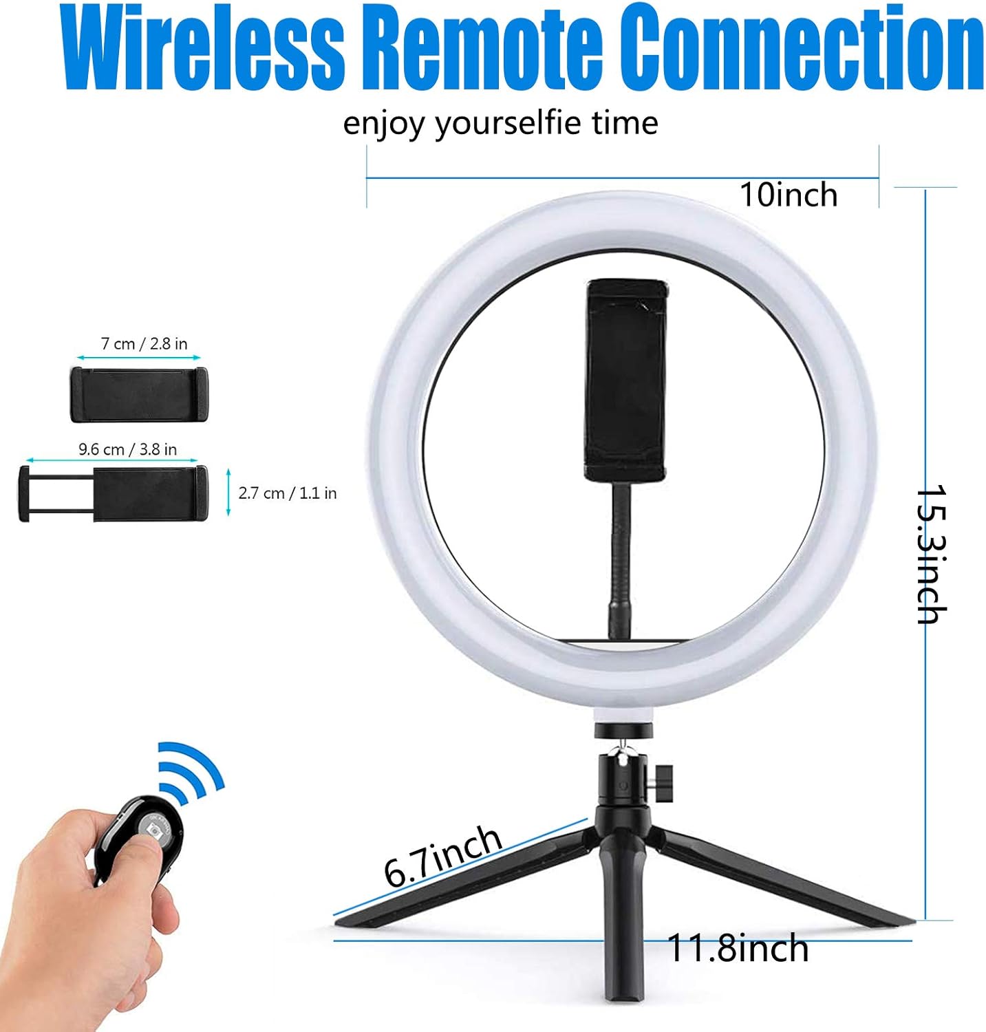 - 【Bluetooth Remote Control and USB Powered】USB ports can be used with various devices, such as connecting USB charger, mobile power, computer host and laptop. LED light ring comes with a Bluetooth controller, suitable for IOS and Android systems (applicable to the size of mobile phone 3.5-6.5 inches), you can control the mobile phone to take photos in 10 meters, the connection is very stable.