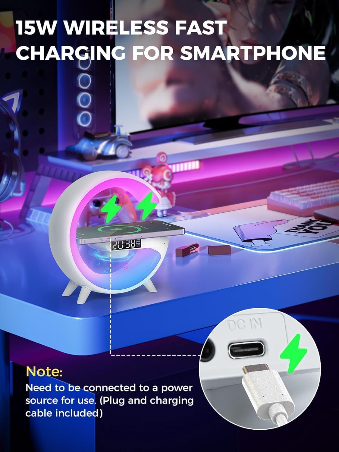 Transform your space with this ultra-modern RGB lamp that’s more than just light — it’s smart ambiance, fast wireless charging, and immersive sound in one sleek design. Whether on your nightstand, desk, or shelf, it’s a statement piece that does it all.